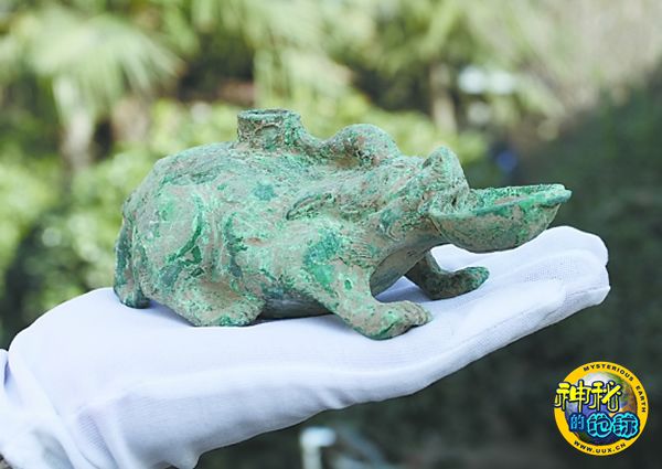 该铜瑞兽砚滴小巧精致,首为龙形,身为蟾蜍,两侧有双翼,四脚呈匍匐状,脊背处有注水口,水通过身体流入瑞兽所衔耳杯中,瑞兽尾巴可做手柄。据介绍,1988年,我市文物工作人员曾在嘉禾屯林场一铜器窖藏内发现过一尊类似的瑞兽砚滴。