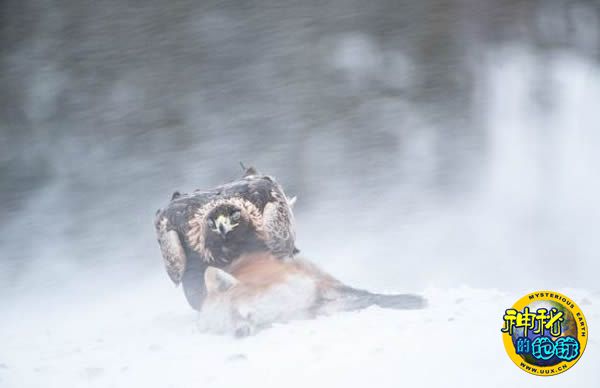 死狐狸沦为金雕的免费午餐,再大的风雪也要先填饱肚子再说。