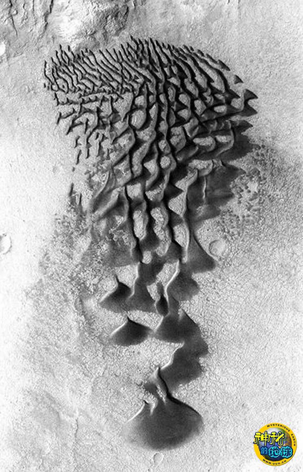 在2006年“火星奥德赛”拍摄的这张照片上,由众多风塑沙丘构成的图案,看起来很像一幅抽象画。按照最初计划,该飞船是去执行一项持续时间仅为3年的任务,但是到今年的10月,美国宇航局已经把它的工作寿命延长了3倍。现在该飞船打算运行到2012年底,这项任务可能还会被延长,用来帮助美国宇航局的火星科学实验室——“好奇”号,该计划预计将于2012年8月发射升空,前往火星。
