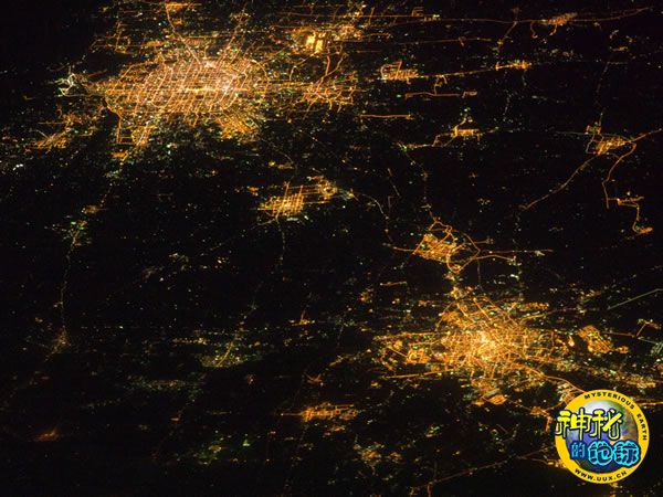 照片中,位于北京和天津之间的廊坊市以及华北平原东北部几个规模更小的开发区同样清晰可见。而图中没有亮光的区域主要是农田,小麦和玉米是主要农作物。