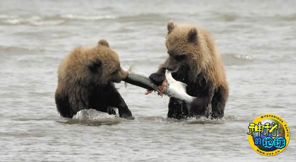 它们用从母亲那里学到的本领,从河中捕到鲑鱼,并一起分享