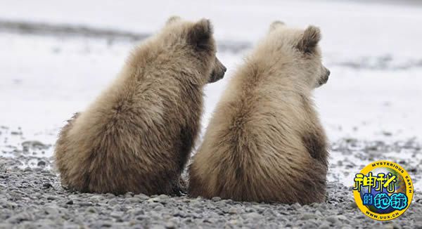 当成年棕熊在银鲑溪捕食鲑鱼时,两只小棕熊并肩坐着望向远方