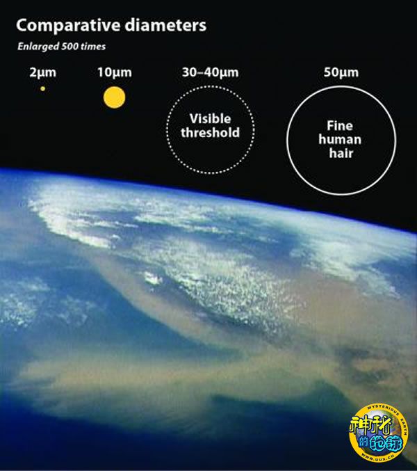 最小的颗粒是粘土级,直径仅2微米,在大气中停留约1周,几乎能周游全球,它将太阳热量反射太空,使地球保持凉爽。较大些的颗粒,属于泥土级,能漂浮几天。颗粒越大,在大气中越倾向于产生热的效果。除了影响大气中的热量,灰尘微粒还会沉积在高山积雪场,吸收热量促进冰雪融化。