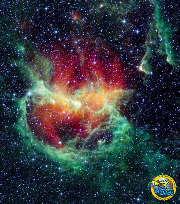 美国宇航局的“广域红外探测器”太空望远镜拍摄的半人马座λ星云,温和的尘云发出红光和绿光,与背景的蓝星相互映衬。红色区域为温度较低的尘埃颗粒,绿色区域由温度较高的雾状物质构成。半人马座λ星云距地球大约5800光年,星云内坐落着很多较为年轻的恒星,诞生于大约800万年前。恒星的强辐射对周围的尘埃产生影响,形成图片中部类似环的结构。在可见光波长下,大部分尘埃并不可见。半人马座λ星云内的氢气因恒星的辐射带电并发光,整个星云的外形类似一个快跑的小鸡,也被形象地称之为“小鸡快跑星云”。