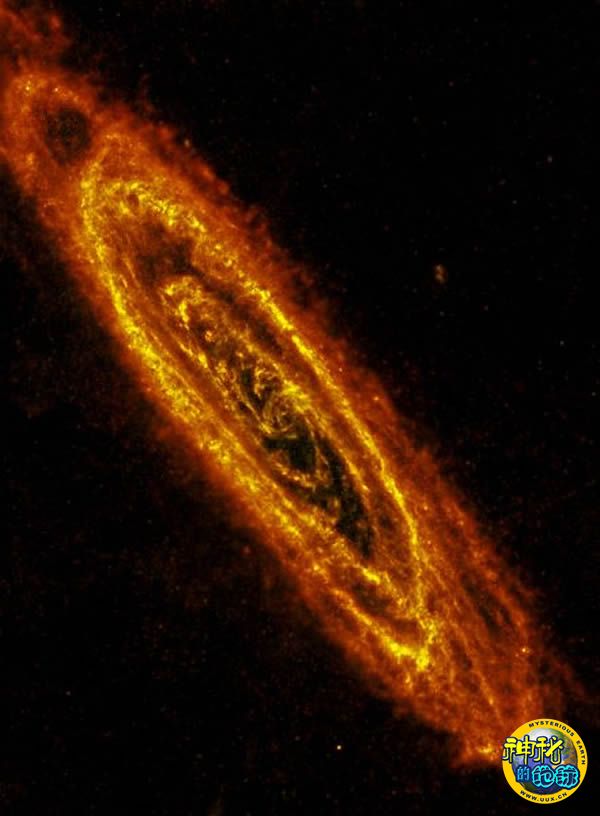 这是仙女座大星系迄今最清晰的远红外波段图像。由赫歇尔空间望远镜于2010年圣诞节期间拍摄。图中有一个明显的尘埃环,这可能是一个小型星系核仙女座星系相撞的结果。