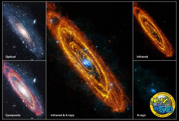 仙女座大星系是距离银河系最近的大型星系,同样包含有数千亿颗恒星。总体而言,这几个波段的图像已经可以揭示出恒星完整的演化历程。赫歇尔 望远镜拍摄的目标主要是温度较低的星际尘埃带,这是孕育新生恒星的温床;可见光波段看到的是成年恒星;而XMM-牛顿望远镜所拍摄的则是恒星垂死时的最后绚烂。