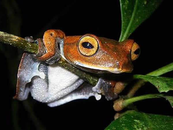 据美国国家地理消息,在越南的山林发现了一种新的会飞的树蛙“吸血鬼”新品种,被称为吸血鬼树蛙。2008年首次发现了这个2英尺长(5厘米)的两栖动物,它只生存于越南南部的云雾森林,它经常使用它那有蹼的手指和脚趾从一棵树滑到另一棵树上。