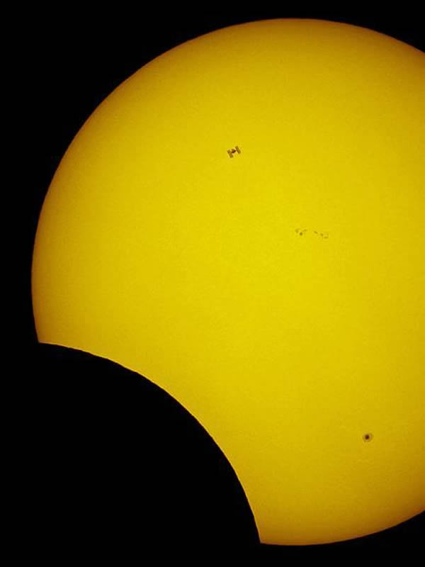 看过影片《星球大战》的人也许会产生这样一种恐惧,认为照片呈现的是西斯帝国入侵,而日盘顶部附近的微小轮廓正是可怕的钛战斗机。实际上,我们在照片中看到的不过是4日发生的日偏食,微小轮廓则是国际空间站。这幅照片在阿曼马斯喀特地区拍摄,拍摄时太阳距地球大约9300万英里(约合1.5亿公里),月球距地球25万英里(约合40万公里),空间站距地球310英里(约合500公里)。