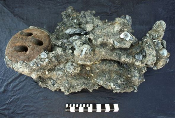 这是最新发现的一个长3英尺(91厘米)的木质三孔滑轮,它是一个滑车,可能曾被“安妮皇后复仇” 号用来调整桅索,控制海上航行。之所以“安妮皇后复仇” 号的大部分结构都被海水腐蚀掉了,而这个三孔滑轮却能幸存下来,是因为它与矿物结合在一起,埋在沙子和沉积物下将近300年。只要不把三孔滑轮周围的矿物移走,不让它接触空气,它就不会烂掉,目前文物保护者把它放在一个水下试验箱里。