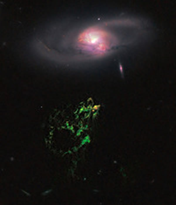 哈勃望远镜的其他观测结果则发现了位于IC 2497星系核心处一个不断膨胀的气泡。“不管是汉妮天体的恒星群,还是星系中央膨胀的气泡,都暗示类星体形成了一种强烈的气体外泄。”Keel说。
