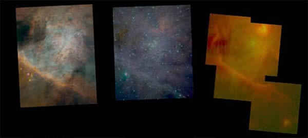 同温层红外天文观测台观测到的猎户座星云中红外线波长图(右)与哈勃太空望远镜在可见光范围内拍摄的图片(左)和欧洲南方天文台在近红外线波长范围内拍摄到的图片(中)进行对比