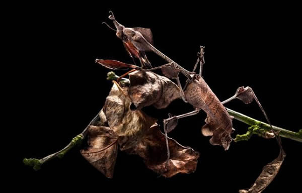 一只小提琴螳螂(Violin Mantis )趴在一堆枯叶中间,很好地伪装了自己