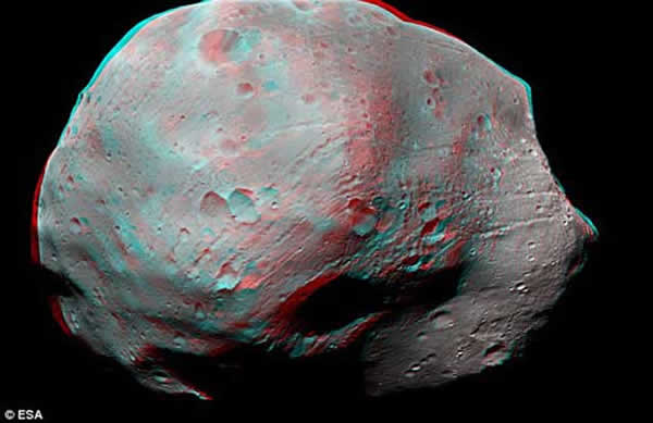 这些最新图片是由火星快车号探测器拍摄的,该探测器体积相当于一个较大的冰箱,自2003年圣诞节发射以来,一直环绕在火星周围进行勘测。由于该探测器运行时与火卫一保持近距离,可拍摄其清晰的3D立体图像。
