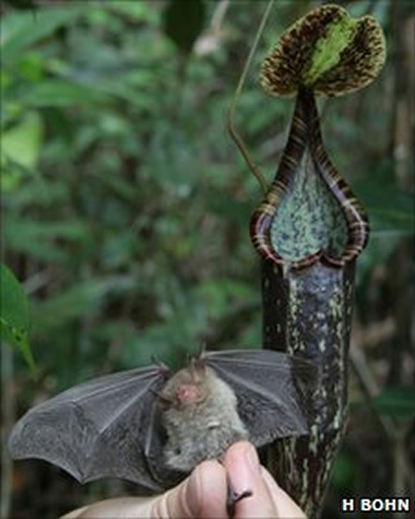 (神秘的地球www.uux.cn)科学家近日在印尼婆罗洲发现,蝙蝠栖息在食肉植物的捕虫囊中。这种异于寻常的生存方式,给双方都带来好处——食肉植物得益于蝙蝠粪便中的营养素,而蝙蝠则安全的藏匿于植物的捕虫囊中。