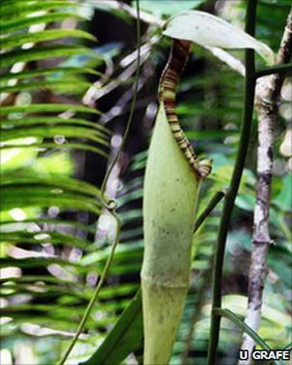乌尔曼·格拉夫(Ulmar Grafe)博士及其研究小组研究这种植物如何补充氮元素的摄入的时候,却惊讶的在其捕虫囊中发现了长毛蝙蝠。格拉夫博士说,“我们完全没有料到会发现蝙蝠居住在捕虫囊中。”而被发现的小型哈氏长毛蝙蝠生活在捕虫囊中部,避开了其底部的消化液。