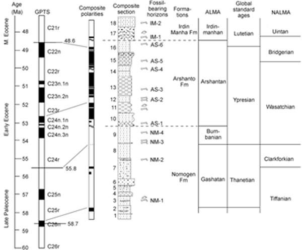 新的研究表明二连盆地呼和勃尔和地区古近纪包括三个组:脑木根组、阿山头组和伊尔丁曼哈组,从中可以划分出12个含哺乳动物化石的层位,其中脑木根组4个,阿山头组6个,伊尔丁曼哈组2个。美国中亚考察团在这一地区划分的“呼尔井组”实际上是伊尔丁曼哈组,而“伊尔丁曼哈组”则为阿山头组。结合最新的古地磁资料,认为脑木根组上部包含了早始新世,阿山头组绝大部分属于早始新世,而不是过去认为的中始新世。格沙头期的延续时间为58.8–55.8 Ma,相当于磁极性年表的C26n–C24r下部;伯姆巴期的延续时间大约为55.8–54.8 Ma,位于C24r中;阿山头期的延续时间为54.8–47.6 Ma,相当于C24r–C21r。因此,将格沙头期、伯姆巴期和阿山头期分别与国际地质年表的塔尼特期、伊普里斯期早期和伊普里斯中晚期至鲁帝特期最早期相对比,同时认为它们分别和北美古近纪提法尼期晚期至克拉克福克期、华沙溪期早期和华沙溪期中晚期及勃里吉期大部相当。古近纪早期,哺乳动物演替以新科出现和属种更替为主,与这一时期大多数情况下气候的逐渐变化相对应;而众多目一级现代哺乳动物类群在始新世之初的突然出现则很可能与发生在古新世-始新世之交的高温事件有关。
