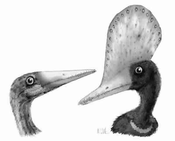 与性别有关的达尔文翼龙特征,雌性无头骨脊(左),雄性有头骨脊(右)(复原图由Mark Witton 博士提供)。