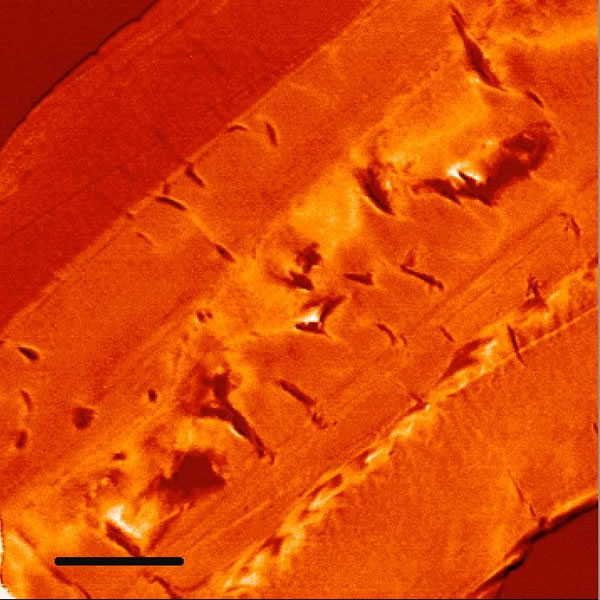 高分辨率X射线吸引光谱显示有机质氮在蝎子化石超薄切片中的分布(亮区),图中黑线长为5µm