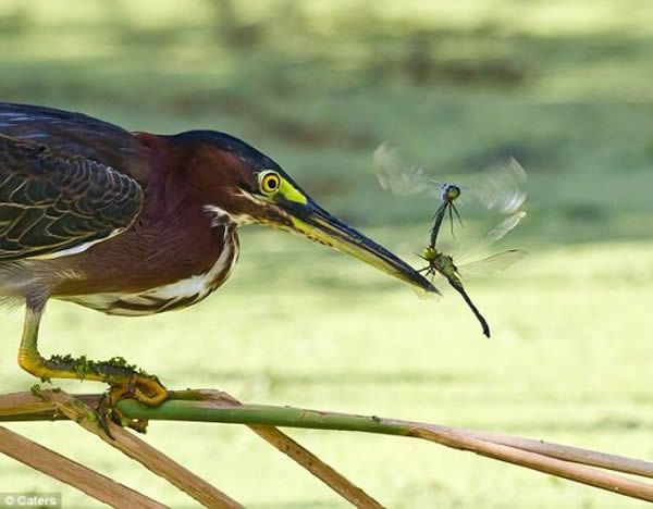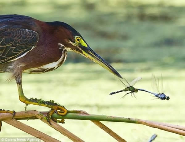 无路可逃:对于绿鹭来说,这是一顿美餐;而对于蜻蜓来说,它根本无路可逃。
