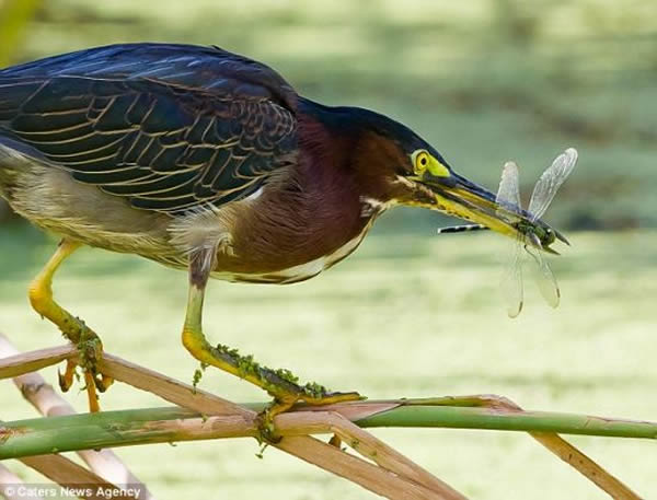 可口的美味:从绿鹭的嘴角边还可以看到蜻蜓的部分翅膀。