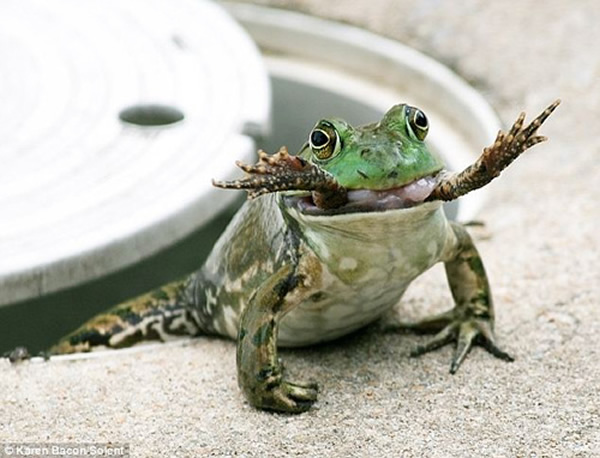 这一幕场景是泰德和凯伦夫妇在清理游泳池时发现的.当时,这只牛蛙嘴外还伸着被吞食对象的两条腿。报道称,被吃掉的显然是牛蛙的“近亲”。