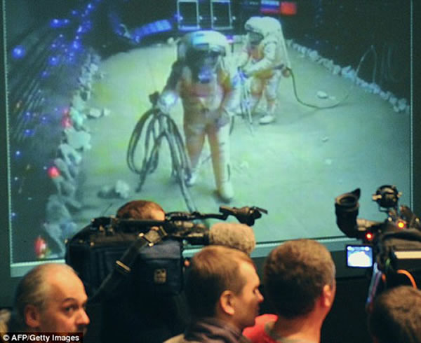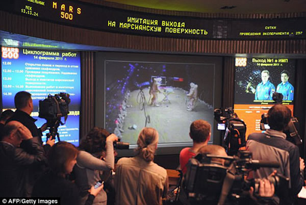 新闻记者正在观看意大利宇航员迭戈-厄比纳(Diego Urbina)和俄罗斯宇航员亚历山大-斯莫列耶夫斯基(Alexander Smoleyevsky)于14日进行的“登陆”火星