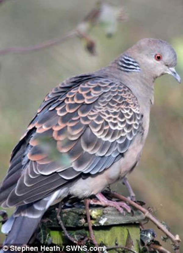 这只山斑鸠(oriental turtle dove)据信是从西伯利亚飞来的,本来要前往阳光明媚的巴基斯坦,结果误入英格兰奇平诺顿(Chipping Norton)。 它与英国斑鸠有亲属关系,但是体格较大,此前在英国只发现过两次。