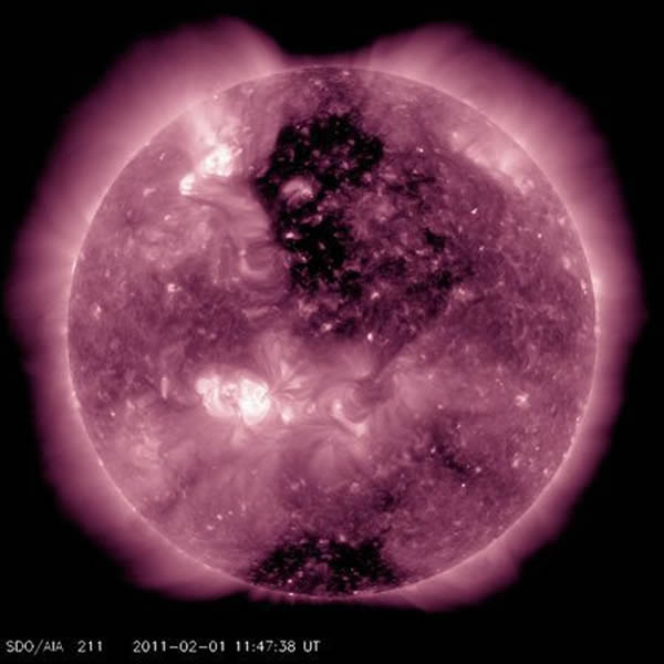 美国国家地理一周精彩太空照:新生恒星环 来源: 神秘的地球 时间:2011年2月16日 16:16 3.太阳黑洞 太阳黑洞(图片来源:SDO/NASA) 2月初,太阳表面似乎出现一个秃斑,即一个指向地球的巨大日冕洞。在美国宇航局太阳动力学观测卫星进行的远紫外观测中,这个黑洞于2月1日在太阳顶端穿过。日冕洞是太阳表面一个带有磁性的空旷区域,向外放射出高速带电粒子。正如太阳动力学观测卫星所观测到的那样,日冕洞旋转并朝向地球,提高了观察到极光的可能性。 上一页12345下一页 上一篇 下一篇