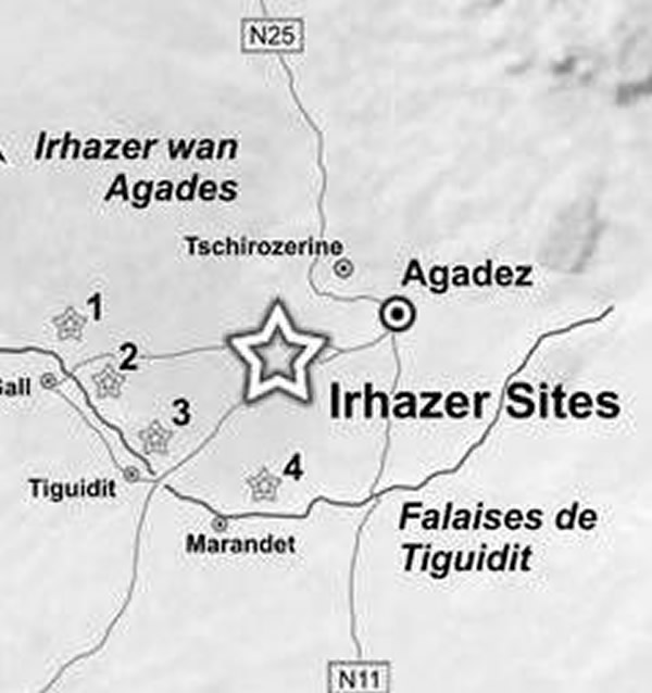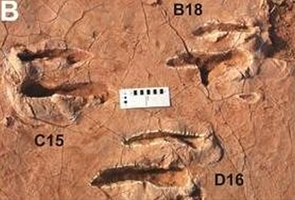 (神秘的地球www.uux.cn)德国和尼日尔的古生物学家在非洲国家尼日尔Agadez盆地的中侏罗世地层Irhazer组中发现了新的恐龙印痕,总共5组120个,平均长约27.5cm,宽约23.1cm,深深地印在其下的砂岩中。它们保存非常完好,是某种双足动物的两趾痕迹。这些脚痕来自兽脚亚目鸟龙手盗龙类(Maniraptoran),它们被学界认为与鸟类的关系很亲密。古生物学家将这些印痕分入新的遗迹分类单元Paravipus didactyloides中。