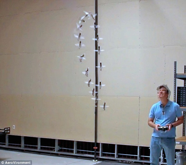 在制造商Aero Vironment八分钟的展示上,“蜂鸟”从一扇门飞进一座大楼,随后又飞出来,并可以对抗每小时5英里的风力。