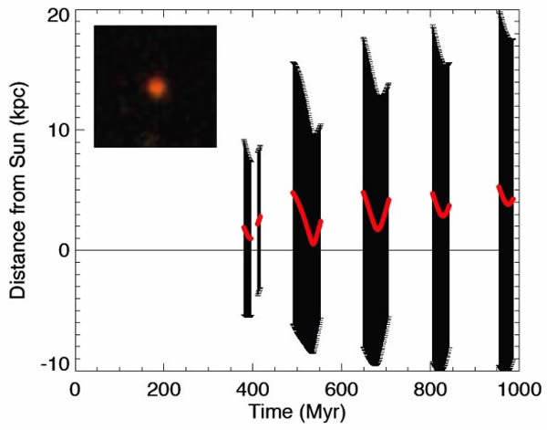 这张图显示了其中一颗潜在的“复仇女神”星与我们的太阳之间的距离(红线)。黑色的柱状体表示误差范围,可以看出这种误差非常大。但是这些恒星确实会周期性地运行到太阳系附近空间。