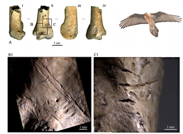 意大利费拉拉大学(University ofFerrara)的M.Peresani在意大利北部的富曼恩洞穴(Fumane cave)中发现了660多枚鸟类骨骼,它们和尼安德特人化石混在一处。其中有斑尾林鸽(Columbapalumbus)、髭兀鹰(Gypaetus barbatus等当地类群。这些鸟类的翅骨上都有切削的痕迹,而那些最宽阔、最坚韧的羽毛,即飞羽,恰好都长在翅骨上。因此科学家们认为,翅骨的切削痕迹是尼安德特人有意剥离飞羽时留下的。