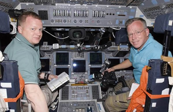 即将到达:“发现”号指令官史蒂夫•林赛和飞行员埃里克•鲍伊呆在该机的飞行甲板上。