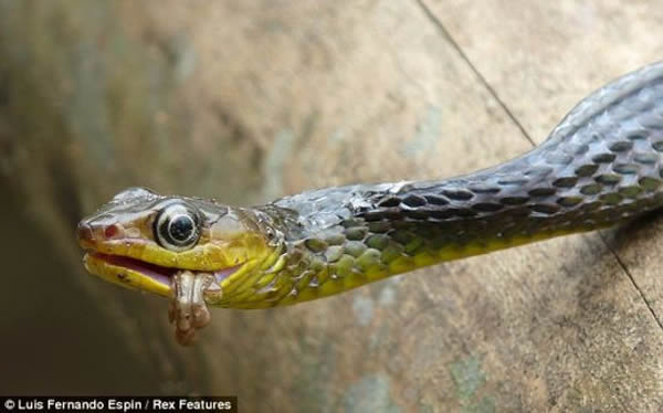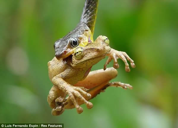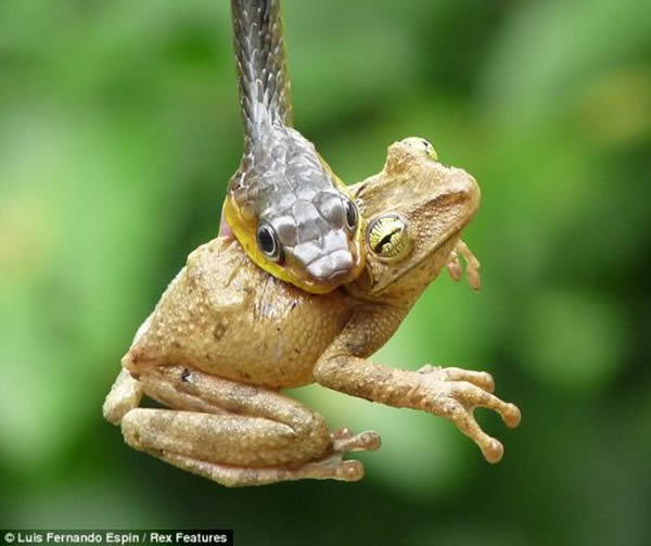 这只可怜的小树蛙徒劳地挣扎了45分钟,最终被贪吃的蛇活活吞下肚。导游兼摄影师路易斯•费尔南多•埃斯宾在厄瓜多尔亚马逊盆地拍摄到这组令人胆战心惊的残酷画面。他说:“我当时正准备吃午餐,我从我的房间走向餐厅时,看到那条蛇。”