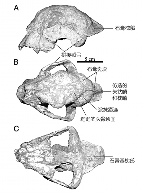 邓涛说:“还有脑颅部分,也是模仿现代猎豹的。由石膏塑造并上色,而顶部和枕部的一些大的圆形石膏斑和未上色部分清晰可见,头骨后部还有许多涂抹石膏的痕迹,说明其脑颅就是一个石膏模型;腹面照片显示,整个基枕部完全由石膏充填,因为这个区域过于复杂,作伪者没有办法仿造,所以在此处看不到任何解剖结构。”