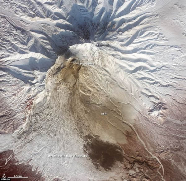 火山灰流堆积物的雪面上覆盖着一层浅棕色灰尘,思维纳弛火山不断扩大的熔岩穹丘上升起一小股羽状烟雾。火山周围的植被呈暗红色。尽管这座火山附近有很多小村庄,但幸运的是,这次爆发产生的火山灰流从人口稀少的地区流过,并未造成人员伤亡。