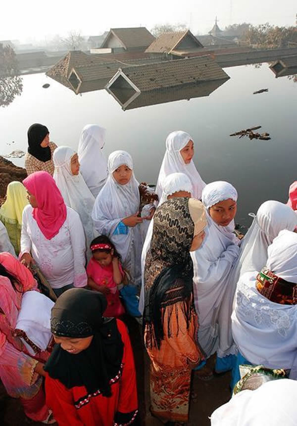 2006年10月,东爪哇希多阿乔村的村民庆祝斋月。在他们的身旁,一座座房屋掩埋在泥浆中。根据《国家地理杂志》的报道,对于露西泥火山2006年喷发的原因,科学家仍存在分歧。很多人将矛头直指一家钻探天然气的公司,其他人则认为喷发由地震所致。2007年,达拉谟大学的科学家公布了一份研究报告。报告指出,在一座天然气探井穿透地下9300英尺(约合2800米)的岩层后,火山的泥浆开始上涌,高温高压水开始“逃逸”。