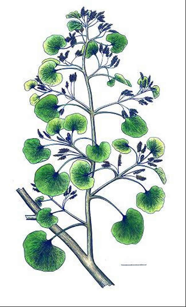 华夏植物群种子植物髻子羊齿科Nystroemia reniformis复原图。比例尺5cm