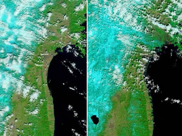 2011年3月12日上午10:30,“大地”卫星搭载的中分辨率成像光谱仪(MODIS)拍摄了右侧这张仙台地区的图像。而左侧的图像拍摄于2011年2月26日,同样由MODIS设备拍摄作为对比参照。