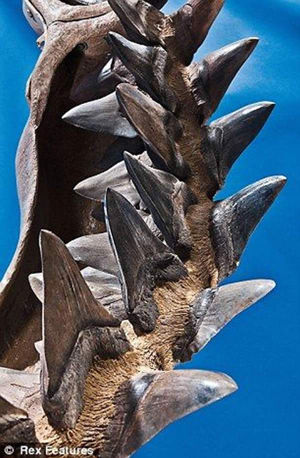 这是有史以来地球上出现的体型最大的食肉动物——史前巨齿鲨的颌骨,与之相比,大白鲨看起来就像条金鱼。这头在大约150万年前死亡的巨齿鲨体长16米,重达100吨,曾是真正的海洋之王。