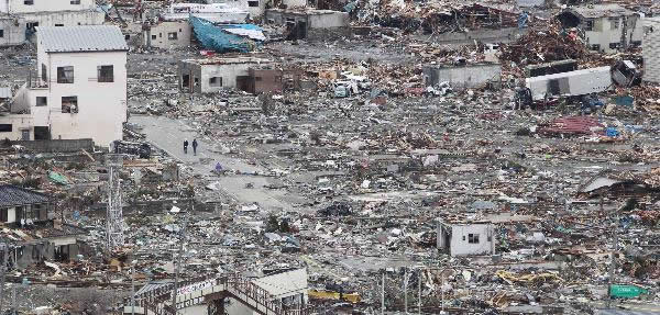 3月16日,在日本大地震重灾区岩手县大船渡市,几名男子在城市的废墟上行走。据日本政府16日上午的最新统计,目前,已有3000多人在3月11日发生的里氏9.0级大地震和引发的海啸中丧生,1万余人失踪,成千上万的人无家可归,位于东北部的宫城县、福岛县、岩手县等地基础设施严重损毁。新华社记者 任正来 摄