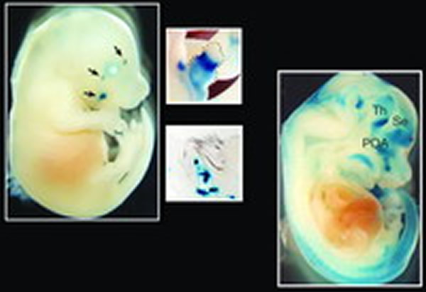 为了搞清这些消失的DNA区域有什么用途,研究人员将黑猩猩的DNA克隆进入小鼠体内,并利用遗传工程手段使得这些DNA在激活后变蓝。第一组DNA出现在发育的小鼠胚胎的阴茎骨中,此外还出现在将要生长感觉腮须的面部,这说明由这些DNA诱发而生长的结构是对雄性激素的响应。第二组DNA则出现在一个名为室下区的大脑区域,这里是神经元生长和扩张的温床。研究人员在最近出版的《自然》杂志中假设,删除这些DNA将移走神经发育的障碍,使得人类大脑得以发展。