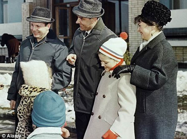 科马洛夫(右三)、他的妻子瓦伦蒂娜和他的两个孩子叶甫根尼及艾莉娜与尤里•加加林(左)在一起。科马洛夫被选中执行“联盟1”号飞行任务。