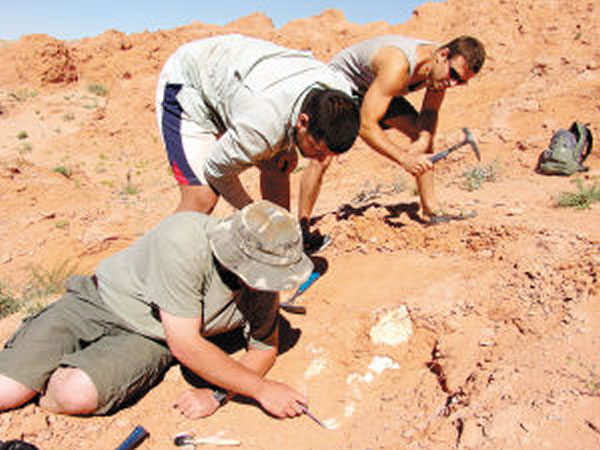 徐星笑了笑说,怎么说呢,反正我们已经习惯了。我们每天要在戈壁上走20多公里,还要背着勘探工具和水,用双眼四处搜寻蛛丝马迹,经常是冒着40℃以上的高温,吸进肺里的空气都是热的,大汗淋漓,你能背多少水?况且,水是那么宝贵,我们都快练成“骆驼”了。在北京,每天冲个澡是生活习惯,在这里就是奢望……而且,常常有风沙,眯眼吃沙子是经常的事。虽然我们早起晚归,尽量避开中午最毒的日头作业,午休也很难呀。营地的帐篷?不能进呀,进去人就成“蒸饺”了!只能钻进汽车底下躺着,在汽车上斜拉下一块帆布遮挡阳光。