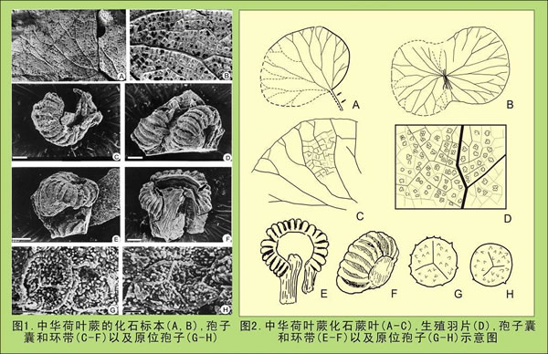 王永栋研究员等发现的中华荷叶蕨,产自内蒙古阿拉善左旗距今1.7亿年的中侏罗世地层中,包括两块生殖器官结构保存完好的压型标本。蕨叶呈近全缘的宽扇形,主脉和侧脉多次分叉形成方形或多角形网脉,每个末级网眼中含有1-2个直径为0.4mm的圆形孢子囊群,无囊群盖。每个孢子囊群中含有3-6个圆形-椭圆形的孢子囊。环带发育、斜生,开裂区位于近轴面。每个孢子囊中的孢子产量可达64-128个。原位孢子圆形至椭圆形,具有三射线,孢子表面密布棒瘤状-锥刺状纹饰,平均直径为28微米,可与分散孢子锥刺孢属(Apiculatisporites)和棒瘤孢属(Baculatisporites)相比较。
