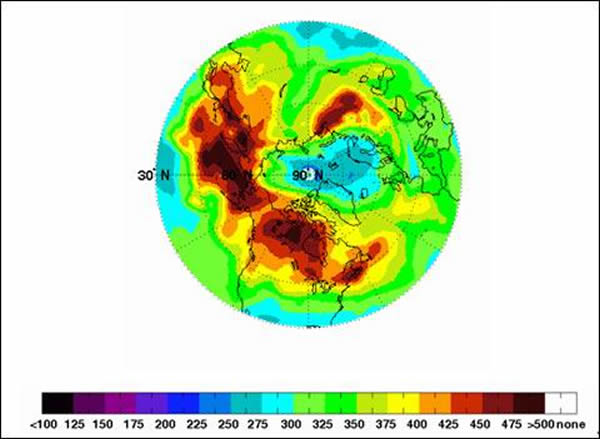 卫星近年来同期监测到的北半球臭氧总量分布,可以看出:一般情况下在三月份北极地区的臭氧含量很高,大部分地区范围在400DU以上,其中接近或大于500DU的区域占很大比例。而今年3月份北极圈内的大部分地区臭氧总量降到了200—300DU,部分地区达到了臭氧洞的标准。