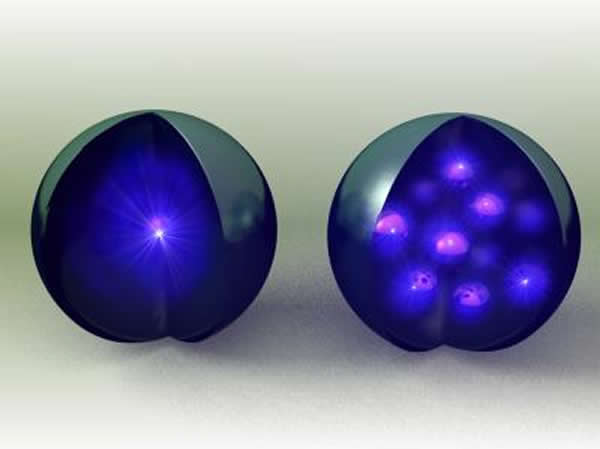 纳米微晶示意图,呈现出单电子波作用自一个纳米微晶体里的杂质原子(左),也呈现出许多电子作用自纳米微晶体(右)里的众多杂质。