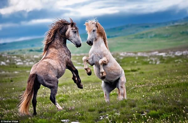 野生动物摄影师维德兰·维达克拍摄了一组引人注目的照片,展现了牡马为争夺交配权展开“拳击赛”的精彩瞬间。多年来,维达克一直在波斯尼亚西部的希卡尔山地区观察和拍摄这些强壮威武的动物,这里是它们的天然栖息地。