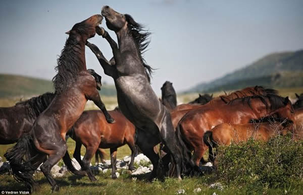 波斯尼亚西部的希卡尔山地区,牡马间的交战正处在进行时,胜利的一方将成为马群的统治者。