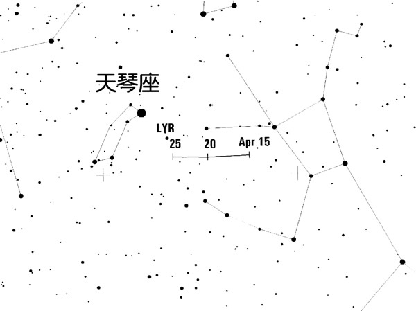 根据国际流星组织的预报,2011年天琴座流星雨的极大期可能出现在北京时间4月22日23时30分至23日10时30分。其中峰值流量预计发生在23日7时左右,每小时理论天顶流星数在18颗以下。虽然这个时间我国大部分地区都已经天亮,但天琴座流星雨极大持续时间较长,22日晚至23日凌晨都是观测的较佳时机。